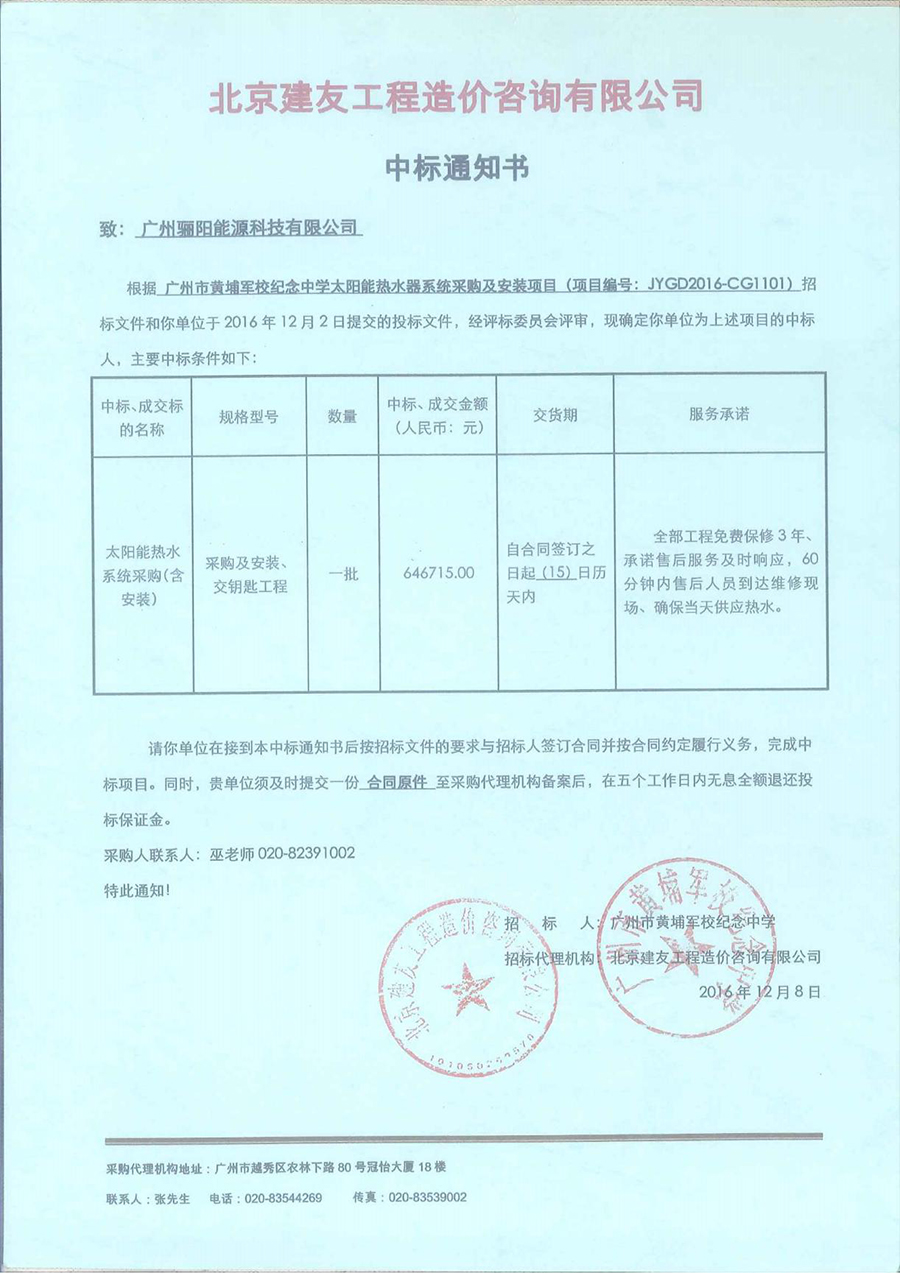 廣州市黃埔軍校紀念中學太陽能熱水器系統采購及安裝項目
